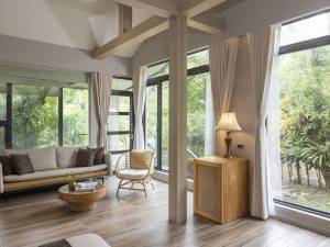 天成逸旅-蝴蝶谷坐落於花蓮縣瑞穗鄉的富源國家森林遊樂區內,為天成飯店集團首度與農業部林業及自然保育署攜手合作,以「永續、生態、度假」為核心理念共同打造的自然旅宿。這不僅是集團首度進駐國 家級森林遊樂區,更是一次將自然保育與旅宿體驗完美融合的創新實踐,打造出一處結合溫泉客房、獨棟別墅、露天湯池與森林步道的生態休憩園地。 與自然山林共生的天成逸旅-蝴蝶谷,匯聚天成飯店集團多年經營休閒與旅宿的深厚經驗,打造兼具舒適與品味的療癒空間。園區內提供多元房型選擇:位於主建物樓層的「會館」客房動線便利、機能齊備;「和風館」客房以大片木質色調與落地窗設計,讓窗外綠意自然流入,營造靜謐溫潤的空間感;獨棟設計的「別墅區」每間客房皆擁有專屬觀景陽台與高隱密性,是享受獨處時光的理想選擇。 園區引自中央山脈珍貴的萬年溫泉水脈,客房內提供礦物豐富的碳酸鹽泉,又稱「黃金湯」,水質富含鐵質,在與氧氣作用後會略呈金黃色澤而得名;戶外湧泉溫泉風呂區則提供雙泉質泡湯體驗,除了黃金湯之外還有被譽為「美人湯」的碳酸氫鈉泉,泉質滑順、泡完後感覺肌膚滋潤,在溫泉及森林中獲得療癒體驗。 天成逸旅-蝴蝶谷從規劃初期即將「環境永續」與「生態友善」列為首要目標,富源國家森林遊樂區是全台最 大的樟樹林及擁有東台灣珍稀的低海拔闊葉林,生物多樣性豐富,也是珍貴的紫斑蝶棲地;每年春天,數以萬計的紫斑蝶自南方遷徙至此,穿越山谷、盤旋花叢,畫面壯麗而夢幻,為園區一大生態亮點。 春日觀蝶、夏日避暑、秋賞紅葉、冬享溫泉,天成逸旅-蝴蝶谷隨四季遞嬗展現截然不同的山林風貌。邀請旅客一同走入蝴蝶飛舞的綠意國度,沉浸山泉中沐浴滋養,讓心靈與自然同步呼吸,在屬於大地的節奏里,展開一段療癒身心、回歸初心的綠意旅程。