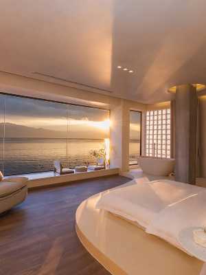 客房配置.觀海大陽台.定製傢俬.無線WIFI、獨立浴缸、24小時熱水、.音響設備等。洗浴間內用.品牌馬油系列沐浴用品,定製品牌洗漱用品.自動智能品牌馬桶。精心為旅行家庭而設計的家庭套房,2米大床一間.一米五小床一間.另配有2米的沙發。親子榻榻米家庭花園房,為小寶貝而準備童趣十足的一些小玩具.小木馬.小帳篷.超大熊貓等。方便家庭入住體驗。