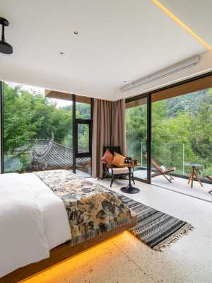 客房均勻地藏在3棟院落內,每間房設計都使用了大面積的落地窗,只為了推窗就是竹林,抬眼就是繁星,均有中央空調暖氣設備、客廳和用餐區域、燒烤設備等等。房間外是一個可以看到整座山的露台。滿眼望去都是綠色。夜深人靜之時,還可以收穫漫天繁星。