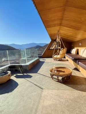 從多功能廳內走上二樓,樓梯口兩邊各有一間客房,30多平米的露台上擺放著樸素大氣的戶外餐桌椅,雙人鞦韆椅,還有燒烤架,場面您可以想象。往裡走穿過一米五寬的玻璃連廊到西樓,西樓三間,中間是茶室,茶室裡除了茶具還備下了筆墨紙硯和書籍、全自動麻將桌,供客人休閒娛樂,兩邊各有一間客房,三個房間均配有LOFT式的木閣樓,家人較多的客人可在閣樓上加兒童床,躺在上邊透過電動天窗就可以看夜空中的星星或月亮,這是多麼的愜意啊。