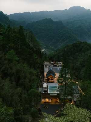 飯店是在青城後山景區內依山環水而建的白房子,有無邊恆溫泳,花徑、枕溪、葉語和望野房型都有單獨湯池。