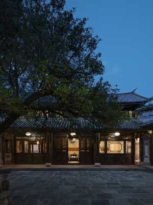 飯店的大門不設門檻,正如古時大理的市井生活,家家流水,戶戶養花,與世無爭。在飯店大門前有一座明朝的武廟照壁,這面照壁建於洪武年間製造,距今600多年。這面珍貴的文物,剛好就成了飯店的一景,也在為飯店遮風擋雨。飯店留有40%的公共空間,讓你真正回歸了大理人昔日的傳統生活。