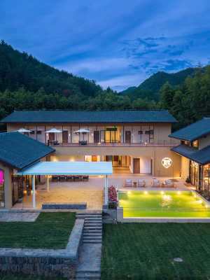 民宿區共12間客房,配套咖啡廳、餐廳、茶室等休閒空間,整體採用三合院建築形制,以院壩空間演繹陝南民居文化,為客人呈現傳統院落生活的詩意棲居。步入核心區,一座典雅三合院豁然眼前。暖色夯土牆與青石瓦頂相映,訴說著土地的溫暖與時光的沉澱。客房錯落分佈,涵蓋大床房、標準間、浴缸大床房及親子房型,滿足多元旅居需求。空間設計摒棄繁複裝飾,以極簡線條勾勒舒適居所。每扇窗都是一幅自然畫框,將蒼翠山巒邀入室內,實現建築與自然的默契對話。