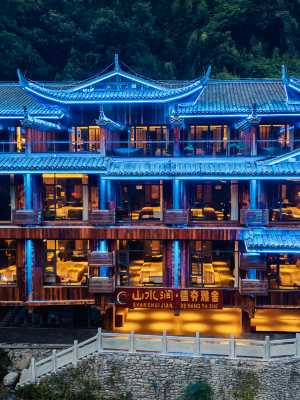 山水澗德夯雅舍民宿坐落於國家AAAAA級德夯風景區的核心腹地,毗鄰千年苗寨群落,坐擁德夯大峽谷、流沙瀑布、矮寨大橋、天問台等自然奇觀。飯店以土家族苗族千年文化為魂,深色美學為骨,打造了一座隱逸於千年苗寨群落的奢野居所。飯店佔地3846.81平方公尺,湘西非遺傳承人匠心打造,以層層退台的吊腳樓建築群呼應峽谷地貌,青瓦木樑、飛檐翹角與落地玻璃幕牆相映成趣,既保留傳統村寨的靈動神韻,又賦予現代奢居的簡約美學。室內以湘西苗族銀飾、刺繡為靈感,將神祕苗疆符號與現代設計語言交織,演繹“隱世不避世”的泊心哲學。 此地是驛站,亦是歸處。當苗鼓聲遠,篝火漸熄,唯有山澗流水與頂樓湯池的私語相伴。山水澗德夯雅舍,客房收納湘西的狂野與溫柔,待君循著銀飾的微光,赴一場與時光同眠的約定。 這裡不僅是棲居之所,更是一場喚醒文化血脈的旅程——於深色祕境中,觸摸神祕湘西詩意與靈性。