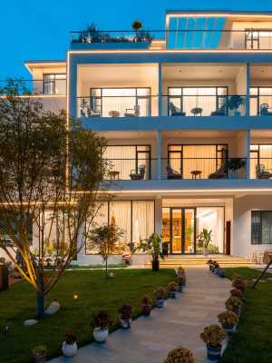 民宿院內有一座心形泳池,皎潔月光與多彩燈光交相輝映,灑落於水面,一片漣漪,講述著一個個白月光的故事。仰望,明月皎潔,俯首,心跡盪漾,這是民宿給予賓客的大情懷和小浪漫。