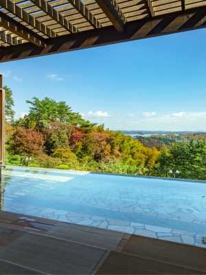 松島大觀莊飯店的魅力在於飯店所在地是日本三大名勝之一的松島,這裡景色壯闊美麗。 政宗和芭蕉所遊覽。 在這裡,您可以盡情欣賞松島清晨、午後和傍晚色彩變幻的壯觀景色。 露天浴場四周環海,綠樹成蔭,從松島灣眺望松島和日出,美景盡收眼底。 請注意,這裡不是溫泉。 從仙台站乘坐 JR 仙石線到松島海岸站(40 分鐘),然後乘坐 “私人穿梭巴士 ”5 分鐘即可到達。 也可乘坐飯店班車。