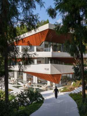 走進山水間民宿,主體建築不規則的外觀,展現著一種精緻與構造的對碰,,綠樹黃石,再加幾個別出心裁的設計,組合著高審美品味的配色,自然的歲月感和現代工學美和諧在一窗之間。窗外“春山半是茶”,窗內“高級感設計”美出新高度。這裡的空間沉穩內斂,承接著傳統與當代的共融,從傳統的厚重中脫穎而出,在當代的理性里擇取雅緻。