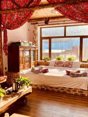 客房以原木為底,柔和暖光裹著潔淨床品,推窗就是霧凇覆林、雪裹村落的原生雪景;熱乎的柴火炕是標配,躺下就能被溫煦裹住,連呼吸都沾著雪谷清冽與房間暖意。